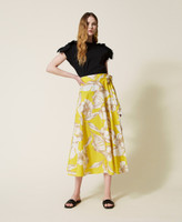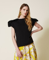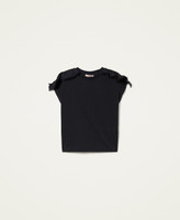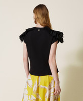 T-shirt regular in jersey di cotone con balze in popeline intarsiato da bordo di macramè in trasparenza.