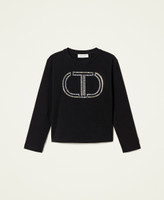 T-shirt in jersey di cotone stretch con logo Oval T in strass e borchie, collo tondo, maniche lunghe.