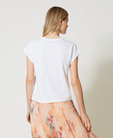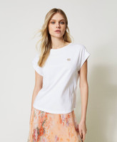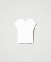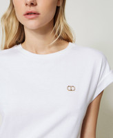 T-shirt in jersey di cotone con logo Oval T in metallo color oro e strass crystal incastonati, linea dritta.