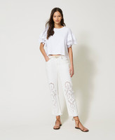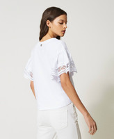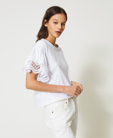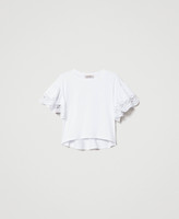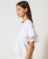 T-shirt in jersey di cotone con collo tondo e maniche ampie a farfalla arricciate ai giri e con bordi in pizzo macramè ondulato.
