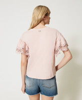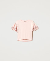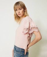 T-shirt in jersey di cotone con collo tondo e maniche ampie a farfalla arricciate ai giri e con bordi in pizzo macramè ondulato.