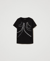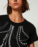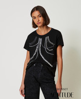 T-shirt collezione Actitude in jersey di cotone con applicazioni di strass, perle e castoni che creano un disegno davanti, collo tondo, maniche corte, linea dritta.