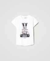 T-shirt regular in jersey di cotone stretch con stampa digitale e dettagli di borchiette e strass termoadesivi, girocollo.