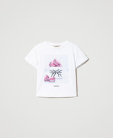 T-shirt in jersey di cotone stretch con stampa fotografica davanti e strass termoadesivi, maniche corte con risvolto.