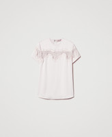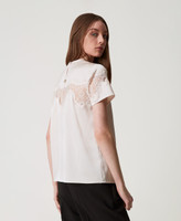T-shirt in raso con pizzo intarsiato in trasparenza sul carré. Maniche corte, apertura a goccia con bottone ricoperto sul retro, linea dritta.