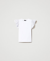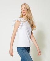 Jolly di stile da indossare su tutto. Top in jersey con linea fitted, collo tondo, maniche corte ad aletta in sangallo che creano volume. Con denim o bottom sartoriali a seconda dei gusti.