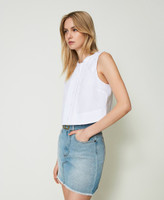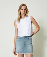 È ricco di dettagli il top corto in popeline di cotone stretch con plastron davanti con piccole pieghe cucite e spalle impreziosite da patch floreali effetto tridimensionale, disegno in esclusiva per Twinset. Ha linea fitted, collo tondo, chiusura con bottoni effetto madreperla, placchetta logo Oval T sul retro, sfoderato. Perfetto per completare bottom a vita alta.