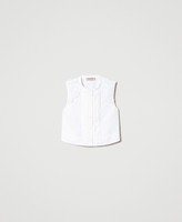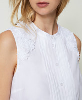 Top in popeline di cotone stretch con plastron a pieghe cucite, spalle decorate da patch floreali effetto tridimensionale.