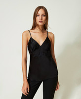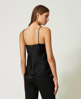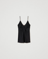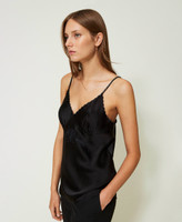 Top in raso di viscosa con ricamo floreale a filo in tono e spalline sottili in pietre crystal, parte inferiore in sbieco.