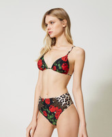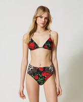 Bikini con stampa a rose e animalier composto da triangolo reversibile e slip alto con patch ricamati ai fianchi.