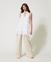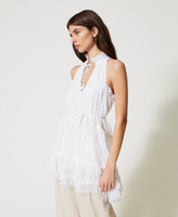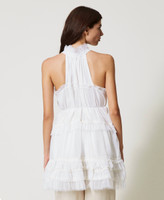 Tunica collezione Actitude in georgette crêpe con volant a taglio vivo, scollatura all'americana con apertura e laccetto, passamaneria à jour.