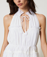 Frills power. Tunica A-line in georgette crêpe con volant a taglio vivo, scollatura all'americana con apertura regolabile con laccetto, coulisse al collo, dettagli con passamaneria à jour. Foderata, da regolare in vita con la cintura rimovibile. Da intrepretare come tunica o mini dress.