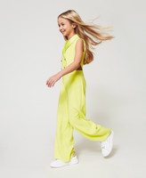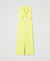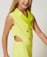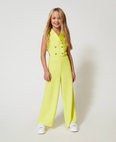 Tuta lunga da bambina in crêpe con top effetto blazer e cut-out ai fianchi. Ha i revers in raso, design doppiopetto con bottoni logati, chiusura con zip sul retro e pantaloni dalla linea ampia. Questa tuta è perfetta per una cerimonia.