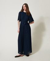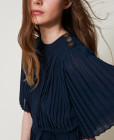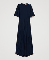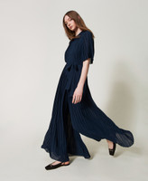 Tuta lunga in crêpe georgette plissé con cintura rimovibile in coordinato in tessuto liscio. Ha collo tondo, spalla con bottoni a vista in metallo con logo Oval T a rilievo, maniche corte a plissé piatto, taglio in vita, pantaloni ampi a mezza ruota, fodera in georgette, chiusura con zip invisibile e placchetta logo Oval T sul retro, linea morbida.