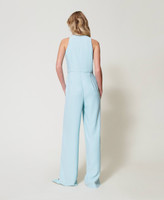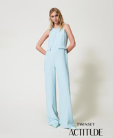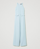 Tuta lunga collezione Actitude in crêpe piquet senza maniche con scollo a vogatore sul retro, taglio in vita, chiusura con zip sul retro, patte applicate, pantaloni dritti e morbidi.