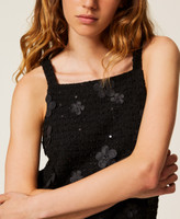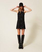 Abito corto in tessuto bouclé con ricamo di fiori tridimensionali. È smanicato con spalline ampie e ha collo squadrato, chiusura con zip invisibile sul retro, fodera, linea dritta.