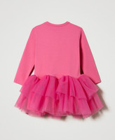 Abito in jersey di cotone stretch con stampa gatto e spicchi di tulle arricciato con fodera in jersey.