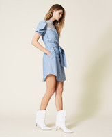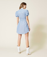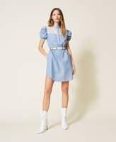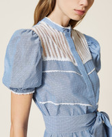 Scegli l'allure romantica dell'abito corto in cotone jacquard a disegno point d'esprit, con inserto in tulle decorato a mano da passamanerie. Ha linea diritta, collo alla coreana, maniche corte arricciate, apertura con bottoni, fondo arrotondato e cintura rimovibile abbinata. Da completare con stivaletti o sandali a seconda del mood.