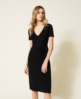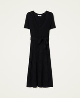 Abito longuette in costina di viscosa stretch con scollatura a V, maniche corte, cintura abbinata.
