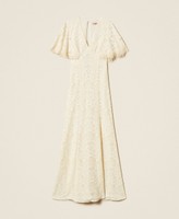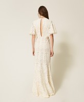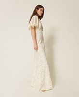 Abito lungo in pizzo con maniche corte effetto volant con smerlo al fondo. Ha scollatura a v, apertura a goccia con bottone sul retro, chiusura con zip al fianco, fodera, linea fitted.