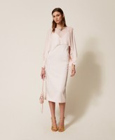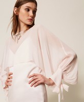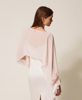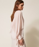 Blusa cropped in georgette di viscosa con fiocchi ai polsi. Ha collo tondo, maniche lunghe a kimono con polsi regolabili, linea ampia. Da indossare anche come coprispalle.