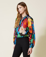 Aggiungi un tocco di colore a tutti i tuoi look con la blusa a maniche lunghe made in Italy in mussola di cotone a fiori multicolor, esclusiva Twinset, ispirati ai giardini estivi messicani. Ha Linea diritta e morbida, collo alla coreana e apertura a V, chiusura con lacci che terminano in nappine colorate, maniche ampie e arricciate, polsi con elastico ricoperto, sfoderata. Con shorts e tote bag per un look quotidiano off-duty.