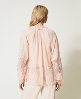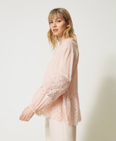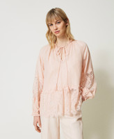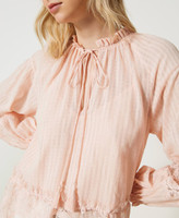 blusa in mussola di cotone tessuto a riga raso con gessatura lurex alternata a bordi alti di pizzo Chantilly con doppio smerlo. Linea ampia con collo tondo rifinito da volant, apertura V davanti, scollo con fettuccia in tessuta finita da nappine in tinta al capo, maniche raglan ampie e arricciate polsi con elastico ricoperto, top in mussola di cotone con spalline regolabili. La costruzione sartoriale mette in corrispondenza le bande di pizzo sulle manche alla balza in pizzo smerlato al fondo.