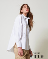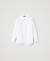 Camicia collezione Actitude in popeline di cotone stretch con ricamo a mano di castoni e perline. Ha chiusura con bottoni, maniche lunghe, fondo arrotondato e linea dritta.
