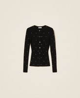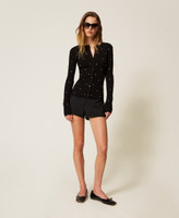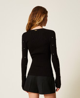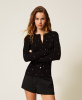 Cardigan in maglia di misto viscosa con applicazioni di cabochon davanti e nelle maniche. Ha collo tondo rifinito a costine, maniche lunghe, chiusura con bottoni, placchetta logo in metallo sul retro, linea fitted.