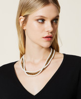 Collana girocollo in catena con giri di perle e logo Oval T decorato da strass, chiusura con moschettone.