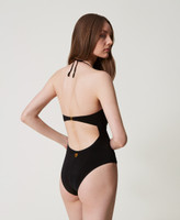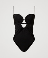 Costume intero con arricciature sulle coppe, inserti drappeggiati davanti e cut-out centrale. Ha coppe doppiate, non imbottite, la chiusura con ganci sul retro, laccetti rimovibili da annodare dietro al collo o da trasformare in spalline grazie alle asole presenti alle estremità. Le coppe mantengono la forma grazie al ferretto interno che profila il perimetro superiore e si agganciano centralmente con bottone e asola. Stecche hai fianchi, slip sgambato, logo a cuore in metallo sul retro, modello interamente foderato.