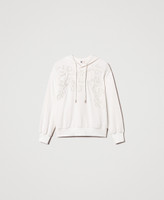 Felpa in misto cotone con ricamo in organza, Cornely e ricamo a filo floreale tono su tono. Ha collo con cappuccio e coulisse e terminali in metallo, maniche lunghe con giro sceso, fondi rifiniti a costine, placchetta logo in metallo sul cappuccio, linea dritta.