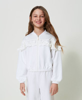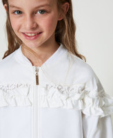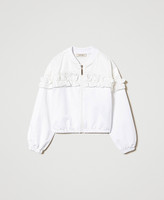 Felpa modello bomber in cotone con pizzo floreale sul carré e maniche, volant in raso applicati, chiusura con zip.