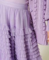 Gonna lunga in tulle con balze arricciate in dégradé, baschina alta, chiusura con zip al fianco, fodera in tono.