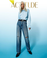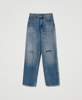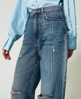 Shiny denim da indossare ovunque. Jeans straight fit a base blu scuro lavato con schiariture localizzate, disegno gessato floreale di strass sui fianchi, cinque tasche, chiusura con zip e bottone. Con sneakers o stivaletti a seconda dei gusti.
