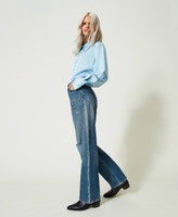 Jeans collezione Actitude con strass ai fianchi a disegno floreale, cinque tasche, chiusura con zip e bottone a chiodo.