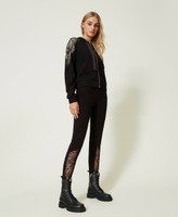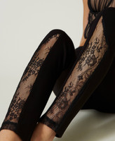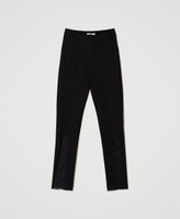 Leggings in punto Milano con impunture davanti, inserti in pizzo al fondo, chiusura con gancio e zip.