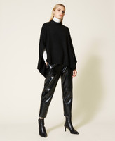 Morbida e caldissima, la maglia a mantella è uno dei key pieces di stagione. Il volume ampio è dettagliato dal girocollo e dal fondo asimmetrico a costine, aperture per le braccia, rigatura verticale e targhetta con logo sul retro. Da esibire su pantaloni ampi o gonne lunghe, anche in viaggio.