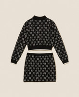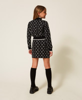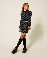 Completo da bambina in maglia di misto viscosa jacquard con logo Oval T all over. È composto da maglia lupetto con maniche lunghe, profili a tinta unita e gonna corta con elastico in vita e linea dritta.