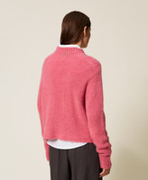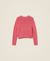 Maglia in misto alpaca con lavorazione rasata, collo tondo, maniche lunghe, fondo rifinito in punto links, placchetta logo Oval T sul retro, linea ampia.