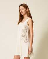 Maxi top in jersey di cotone con applicazione in trasparenza di ricamo floreale crochet. Ha scollo ampio tondo, profili rifiniti, logo a cuore in metallo sul retro, linea morbida.