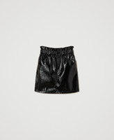Minigonna collezione Actitude in vinile con elastico e arricciatura in vita, chiusura con zip e bottone, tasche ai fianchi.