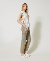 Twinset rivisita i pantaloni cargo con la sua impronta inconfondibile in questo modello realizzato in bull di cotone e viscosa, con inserti in pizzo macramè a disegno floreale. Le diverse texture, i materiali alternati e la tintura in capo old conferiscono al capo un effetto cromatico ricercato. Hanno la linea morbida, i passanti in vita, le tasche con patta e soffietto ai fianchi, la chiusura con zip e bottone, tasche a doppio filetto con macramè e placchetta logo Oval T sul retro. Basta indossarli per dare carattere a qualsiasi look.