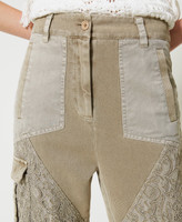 Pantaloni cargo in bull di cotone e viscosa con inserti in pizzo macramè floreale, tintura old, zip e bottone.