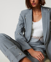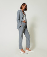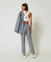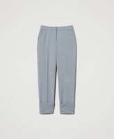 Pantaloni collezione Actitude in tessuto misto viscosa mano calda effetto flanella con ricami fatti a mano di castoni e perline al fondo. Hanno vita regular, chiusura con gancio a uomo e zip, tasche alla francese davanti e a filetto sul retro, piega stirata, fondo con risvolto alto, linea a sigaretta.