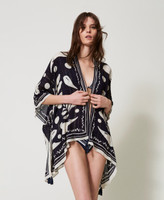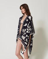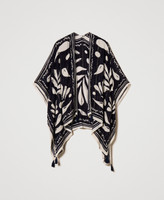 Poncho in misto viscosa con stampa palme di collezione e nappe in tinta al fondo.