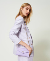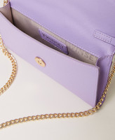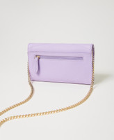 Portacellulare effetto pelle a stampa saffiano con Oval T in metallo, chiusura con patta e bottone, tracolla in catena.