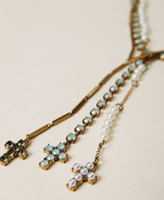 Indossa come preferisci questo set di tre rosari, da portare insieme o separatamente. Sono realizzati in pietre colorate, strass e perle, con croce pendente, galvanica ottone ramato e chiusura con moschettone. Perfetti per accessoriare il look con un tocco ricercato.