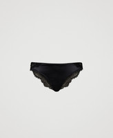 Invisibile sotto gli abiti lo slip brasiliana in raso davanti e pizzo rébrodé smerlato sul retro, placchetta logo a cuore e fiocco in tono dietro. Da completare con il reggiseno in coordinato che preferisci.