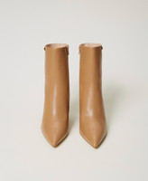 Stivaletti ankle boots effetto pelle con punta sfilata, gambale a tubo con targhetta logo, zeppa ricoperta in tono.
